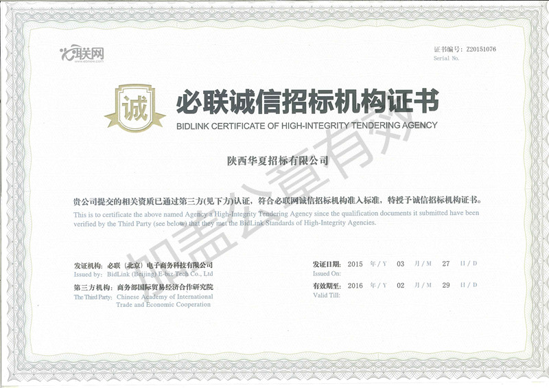 必聯(lián)誠信招標(biāo)機構(gòu)證書